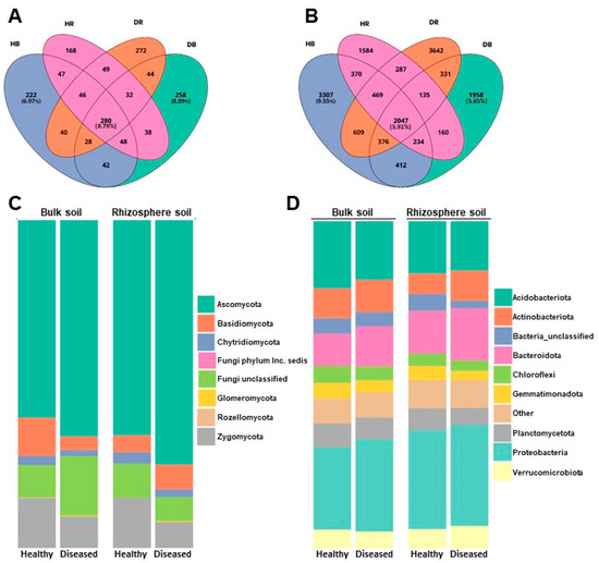 Venn diagram illustrating the overlap in number of OTUs identified in fungal (A) and bacterial (B) communities in samples, and representation of the relative abundances of the most represented fungal (C) and bacterial (D) phyla in the two soil types (bulk and rhizosphere) and the two conditions (healthy and diseased) analyzed.