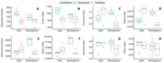 α-diversity was estimated with Chao1 and Shannon indices by means of the Phyloseq package [38]. In addition, the Pielou’s index [39] was computed by dividing the Shannon index by the logarithm of observed richness. These indices were fitted to a generalized linear model (GLM) with a Gamma error distribution with a logarithmic link function suing the MASS package v.7.3-58 [40]. In all models, the effects of the soil type (bulk/rhizosphere) and their condition (healthy or diseased) were analyzed, as was the interaction between both factors. When no significant interaction was found, it was removed. Finally, for significant factors, a post hoc pairwise comparison of the estimated marginal means was performed with emmeans v.1.7.5 [41], adjusting the p-value with the FDR method [42].