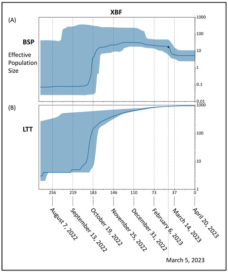 BSP of the recombinant XBF (Figure 4A) showed an initial period characterized by a flattened genetic variability, after which an increase of the viral population size occurred with a very severe curve peaking about 183 days before 20 April 2023 (i.e., 19 October 2022). After that genetic variability suffered slight oscillations until about 46 days before 20 April 2023 (i.e., 5 March 2023) when the population size reduced for the last time starting its last plateau that is still lasting. Lineages through times plot (Figure 4B) indicate a consistent increase in the number of lineages started about 183 days before 20 April 2023 (i.e., 19 October 2022) and then a slight increase with a very mild curve.