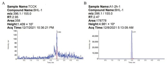 Sulfonylurea herbicides have strong polarity and high water solubility, which can easily pollute groundwater and pose a threat to crops, aquatic organisms, and soil microorganisms and may eventually threaten the health of consumers through the food chain. It is of great significance to establish a simple and economical detection method for the detection of TBM residues to reduce its risk. The QuEChERS pretreatment method was developed in 2003 and has been widely used in the detection of pesticide and veterinary drug residues in food and environmental samples [,]. Dong et al. established QuEChERS and rapid-resolution liquid chromatography–tandem mass spectrometry (RRLC-MS/MS) for the determination of TBM in wheat plants, grains, and soil []. Using this method, we used acetonitrile as the extraction solvent, sodium chloride and magnesium sulfate for the salting-out process, C18 and GCB as purification materials, and UHPLC-MS/MS to determine TBM in soil. The chromatogram of TBM in soil is shown in Figure 1.