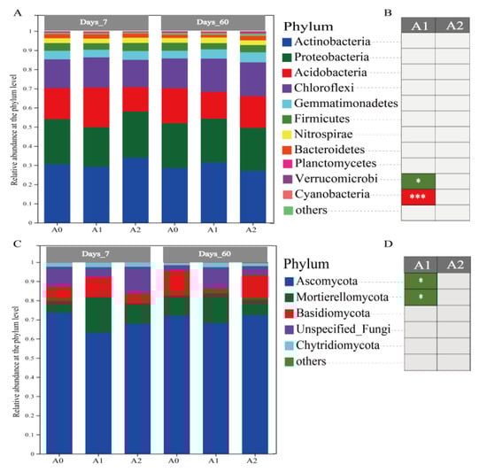 The relative abundances and significance differences of the species on the phylum level. Relative abundances of soil bacteria (A) and fungi (C) at the phylum level. Compared with A0The species differences of bacteria (B) and fungi (D) at the phylum level of the BR treatment compared with A0. Green represents an abundance decrease, and red represents an increase. * Represents p < 0.05; *** represents p < 0.001.