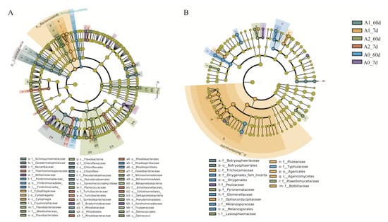 Linear discriminant analysis cladogram diagrams of bacteria (A) and fungi (B) at different taxonomic levels (LDA > 2).