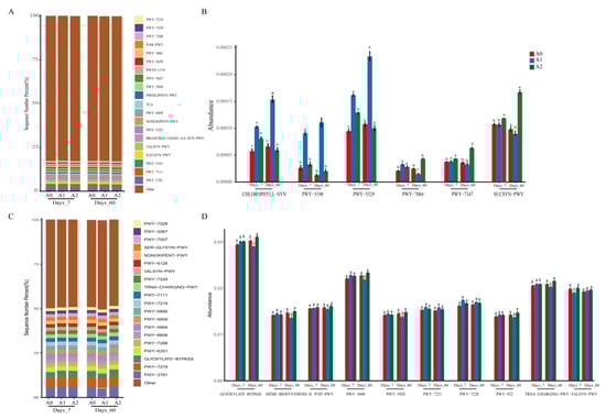 Soil microflora plays a vital role in the agro-ecosystem []; therefore, further analysis of the impacts of BR and TBM on the soil ecological functions metabolic pathways of bacterial 16s and fungal ITS sequencing data was conducted using the KEGG database (Figure 6). At the L1 level, the proportion of bacterial metabolism was the highest (75.4–75.8%). This was followed by genetic information processing (9.7–9.9%) and cellular processes (5.5–5.7%). Finally, for human diseases, there was organismal systems and environmental information processing. The main pathways of microbial metabolism mapped to the L2 level were amino acid metabolism, carbohydrate metabolism, coenzyme factor, vitamin metabolism, other amino acid metabolisms, lipid metabolism, etc. At the L3 level, 394 signaling pathways were mapped, including valine, leucine, and isoleucine biosynthesis; biosynthesis of terpenoids and steroids; synthesis and degradation of ketone bodies; lipoic acid metabolism; and fatty acid biosynthesis and other metabolic pathways. It is worth noting that there were significant differences in six pathways of MetaCyc, in which A1 treatment increased in the CHLOROPHYLL-SYN (chlorophyllide a biosynthesis I (aerobic, light-dependent), PWY-5198 (factor 420 biosynthesis), and PWY-5529 (super pathway of bacteriochlorophyll a biosynthesis) pathways, and A2 treatment significantly increased in the PWY-7084 (nitrifier denitrification), PWY-7347 (sucrose biosynthesis III), and SUCSYN-PWY (sucrose biosynthesis I (from photosynthesis)) pathways. Fungi sequencing information was mapped to the composition of functional genes, and metabolic pathways were analyzed in the MetaCyc database. The top 20 signaling pathways for fungal abundance included aerobic respiration I (cytochrome c, PWY-3781), aerobic respiration II (cytochromec, yeast, PWY-7279), GLYOXYLATE cycle (GLYOXYLATE BYPASS), triphosphate inositol biosynthesis (PWY-6351), and β-fatty acid oxidation (peroxisome, yeast, PWY-7288). The difference analysis of the MetaCyc pathway showed that GLYOXYLATE BYPASS in the A2 treatment was significantly higher than in the A0 treatment. For A1, pathway I (PWY-7228) for the de novo biosynthesis of guanosine nucleotides was increased considerably, while GLYOXYLATE-BYPASS, tricarboxylic acid cycle II (PWY-5690), tRNA-charging-PWY, and TRNA-CHARGING-PWY increased. In conclusion, brassinosteroids significantly altered some ecological functions related to metabolism.