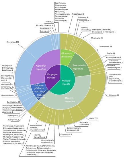 Distribution of sequenced genomes among genera. Different shades of green and brown—Mucoromycota; purple and blue—Zoopagomycota.