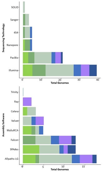 - Segerman, B. The Most Frequently Used Sequencing Technologies and Assembly Methods in Different Time Segments of the Bacterial Surveillance and RefSeq Genome Databases. Front. Cell. Infect. Microbiol. 2020, 10, 527102. [Google Scholar] [CrossRef] [PubMed]