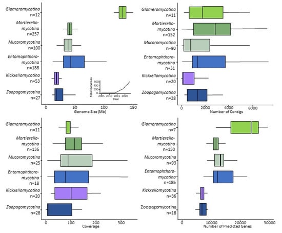 The number of sequenced fungal genomes continues to grow exponentially, and genomic data have become widely and freely accessible. While most sequenced genomes are from Ascomycota and Basidiomycota (Dikarya) species, there have been concerted efforts to sequence genomes of early-diverging and underrepresented lineages [,,,,]. Since 2014, the number of zygomycete genomes has grown from a dozen [] to nearly a thousand. However, 70% of these genomes are still in the draft stage, and not all of them are available. While the number of species with sequenced genomes for all organisms is on the rise, the available pool of zygomycete genomes is exceptional due to its diversity, i.e., one-third of ca. 1000 known zygomycete species have already been sequenced (Supplementary Table S1 []).