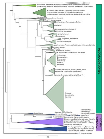The first genome sequence of a zygomycete fungus was from a clinical strain of Rhizopus delemar that was isolated from a patient with mucormycosis—a highly destructive and lethal infection that is typically seen in immunocompromised hosts. Sequencing of the R. delemar genome was driven from the clinical perspective, but it also provided the first genome of a fungus outside of the Dikarya []. Moving forward a decade, a landmark project generated genomic sequences of all species known to cause mucoromycosis in humans. Thirty zygomycete genomes were sequenced and assembled for this project []. Another substantial advance in zygomycete genomics was made by the ZyGoLife team, comprising the efforts of 12 mycological labs across the USA and Canada in collaboration with the US Department of Energy Joint Genome Institute (JGI) []. The phylogenomic study by Spatafora et al. [] found that the former Zygomycota phylum was not monophyletic but instead comprised two distinct lineages—the primarily plant-associated saprotrophic and mycorrhizal Mucoromycota versus the primarily mycoparasitic or animal-associated parasites and commensals in the Zoopagomycota. However, further analyses using phylogenomics data to resolve the evolutionary relationships of zygomycetes have yielded slightly conflicting results. Although Zoopagomycota and Mucoromycota are maintained as monophyletic lineages, a recent study by Li et al. [] found that Zoopagomycota and Mucoromycota formed one larger monophyletic clade in some (but not all) of their analyses. In contrast, other recent phylogenomic studies by Strassert and Monaghan [] and Galindo et al. [] recovered a topology that was similar to Spatafora et al. [], where the Zoopagomycota were resolved as the sister group to all terrestrial fungi. In many of the studies, the position of Glomeromycotina has been problematic, suggesting that more work will be needed to resolve the placement of this clade [,].