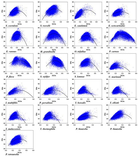 Figure 1. Relationship between the ENc and GC3 content at the third codon position of the 21 ciliate species. Blue dots represent the genes.