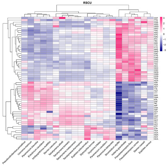 The RSCU value can reveal the codon usage pattern of the gene. RSCU values <1, =1, and >1 indicate that the frequency of codon usage is below, equal to, or above average values, respectively. Codons with RSCU values >1.6 and <0.6 were considered over-represented and under-represented, respectively [63]. The RSCU values of 59 codons (the exceptions being ATG, TGG, and three stop codons) in the 21 ciliate species were analyzed to show if there were differences among the four classes represented.