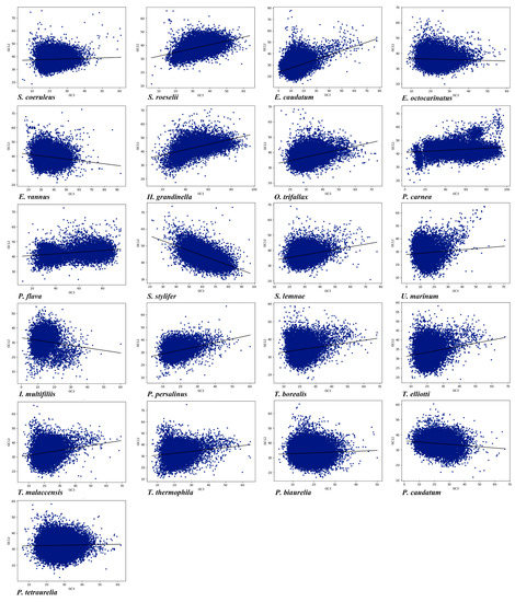 Correspondence analysis creates a series of orthogonal axes to determine the tendency to explain variation in data, with each subsequent axis explaining a gradual decrease in the amount of variation [79]. RSCU correspondence analysis in the 21 ciliate species was carried out show the trend of CUB based on RSCU values. In order to minimize the influence of amino acid composition on codon usage, each gene was represented as a vector with 59 dimensions, and each dimension corresponded to the RSCU value of a justice codon (excluding Met, Trp, and three stop codons) [80]. The first axis (axis 1) of the 21 species contributed 5.82% to 37.59% of the total variation, and the accumulative variation of the first four axes was 23.71% to 55.11% (Table 3). The first axis accounted for most of the variation of the RSCU deviation in these genes and was the main factor determining the codon usage pattern in these ciliates, the influence of the other axes being insignificant. The genes were plotted on a planar graph with the first axis as the abscissa (horizontal axis) and the second axis as the ordinate (vertical axis), respectively (Figure 5). The scattering of the genes in the graph indicated that CUB was not affected by a single factor but rather was determined by many different factors. To verify the association between CUB and nucleotide compositions, we performed a correlation analysis between nucleotide compositions and axis 1 (Table S2). This showed a significant correlation in each species indicating that there was a correlation between CUB and nucleotide compositions. Axis 1 was significantly correlated with GC and GC3, indicating that mutation pressure was an important factor affecting CUB. In addition, CAI, ENc and axis 1 were significantly correlated with each other. Through codon correspondence analysis, we explored the codon usage patterns (Figure S3). We found that axis 1 could distinguish codons ending in G/C and A/T just as easily as axis 2 could distinguish codons ending in T/C and A/G, confirming the previous conclusion (described in the section on Nucleotide Compositions and PR2-Plot Analysis) that these ciliates preferred using codons ending in AT, especially pyrimidines.