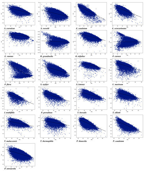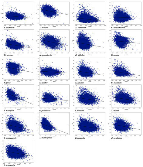 Amino acid composition and gene length can affect CUB. Here, we conducted the correlation among Gravy and Aroma of amino acids, gene length ENc, and GC content in the genome of each of the 21 ciliate species. As shown in Table S2, it can be seen that the Gravy of 20 species (the exception being Tetrahymena malaccensis) was significantly correlated with GC content (Figure 7), and the Gravy of 19 ciliate species (the exceptions being P. caudatum and E. caudatum) was significantly correlated with ENc. In the 21 ciliate species, there was a significant correlation between Aroma and GC content (Figure 8), and a very high correlation between Aroma and ENc in 16 species (the exceptions being P. tetraurelia, U. marinum, T. malaccensis, S. coeruleus, and P. carnea). The gene length of 17 species (the exceptions being P. traurelia, P. persalinus, Ichthyophthirius multifiliis, and H. grandinella) was significantly correlated with GC content, and the gene length of all 21 species was significantly correlated with ENc. In addition, except for P. caudatum and P. persalinus, the gene length was markedly positively correlated with ENc (Table S2). This indicates that gene length was significantly negatively correlated with CUB. A previous study has reported that longer genes have weak CUB because selection may reduce the size of highly expressed proteins, and this effect is particularly pronounced in eukaryotes [10]. The results of the present study showed that the amino acid compositions and gene lengths could affect the CUB, but the absolute values of the correlation were low, indicating that they were only the secondary factors affecting CUB in the ciliate species investigated here.