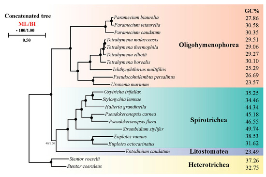 The orthologous proteins alignment of the 21 ciliates species generated by Orthofinder [71]. The maximum likelihood (ML) tree was generated using RAxML version 8.2.12 (-x 12,345 -p 12,345 -m PROTCATLGF -N 1000 -f a) [72]. The Bayesian inference (BI) analysis was performed using PhyloBayes-MPI version 1.4 (-cat -gtr -x 10 10,000) [73].
