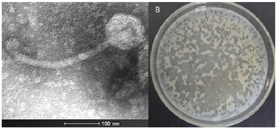 The high titer phage stocks were prepared in LB media (see Section 2.2), and the solutions were placed on electron microscopy (EM) grids and stained with 1% phosphotungstic acid (Vetec, Bs. As., AR). Micrographs were taken at 135,000× at 120 kV using a Tecnai G2-12-FEI Spirit Biotwin EM instrument [22] at the microscopy center at UFMG.