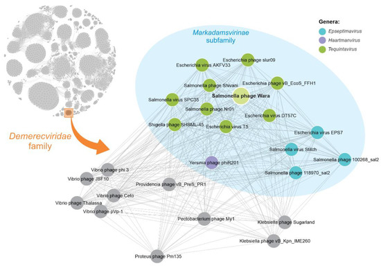The predicted proteome of Salmonella phage Wara was clustered with the proteome of 24 phages of the Demerecviridae family. Phages belonging to the Markadamsvirinae subfamily are shaded in blue. Each node represents a single phage genome, and the edge represents significant similarity between proteomes of connected phages.