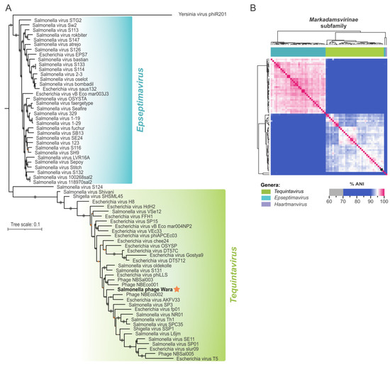 Phylogeny analysis and genomic diversity of the Markadamsvirinae subfamily. (A) Phylogenetic tree of Markadamsvirinae genomes highlighting two phylogenetic clades that correspond to the genera Epseptmavirus and Tequintavirus. The Salmonella phage Wara genome is in bold and highlighted with an orange star. A total of 46 core genes were used to build a maximum-likelihood phylogenetic tree using IQ-tree (see methods for details). Bootstrap values below and above 70% are represented by orange and black dots, respectively. (B) Pairwise average nucleotide identity (ANI) was calculated with 72 Markadamsvirinae genomes. Colors depict the degree of genome identity. The Salmonella phage Wara genome is highlighted with a black star.