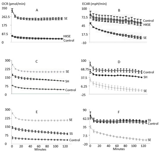 Real-time and live cell analysis of glycolysis based extracellular acidification rate (ECAR) and mitochondrial oxidative phosphorylation (OXPHOS) based on the oxygen consumption rate (OCR) were performed by the Seahorse XFp Analyzer. The effects on ECAR and OCR in macrophages of non-treated control, treated with HKSE (heat-killed S. Enteritidis), or infected with different Salmonella strains were measured. (A,B): OCR and ECAR of control, HKSE treatment, and SE (S. Enteritidis) infection; (C,D): OCR and ECAR of control, SE, and SH (S. Heidelberg) infection; and (E,F): OCR and ECAR of control, SE, and SS (S. Senftenberg) infection.