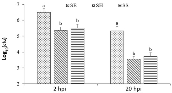 Intracellular viable Salmonella at 2 and 20 hpi. SE (S. Enteritidis), SH (S. Heidelberg), and SS (S. Senftenberg). Different letter (within each time group) indicates that the difference between the Salmonella strains is statistically significant (p ≤ 0.05).