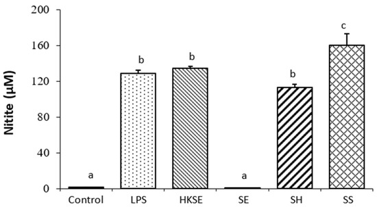 Nitrite production by activated macrophages. Macrophages were stimulated with 0.1 µg/mL of lipopolysaccharide (LPS), heat-killed S. Enteritidis (HKSE), or infected with three Salmonella strains, S. Enteritidis (SE), S. Heidelberg (SH), and S. Senftenberg (SS). Different letters (within each time group) indicate that the difference between the treatment groups is statistically significant (p ≤ 0.05).