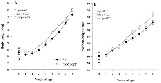 Body weight (Panel (A)) and withers height (Panel (B)) from 1 to 8 weeks of Holstein dairy calves born to dams classified as subclinical ketotic (SK; ≥1.4 mmol/L) or nonketotic (NONKET; <1.4 mmol/L) during the first 10 days postpartum. Body weight and withers height at birth was included at week 0, and only birth body weight was different between groups (#; p = 0.05). The p-values for the main effect of group (G), time (T), and their interaction (G × T) are shown. Values are means, and SE are represented by vertical bars.