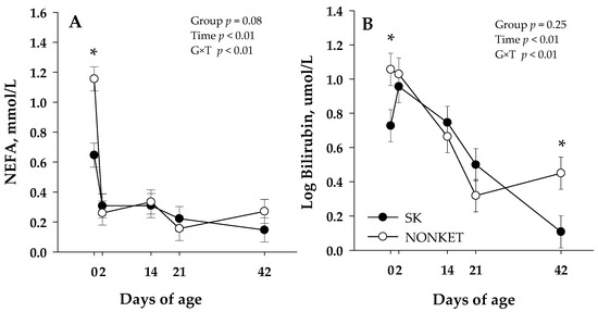 Blood non-esterified fatty acid (NEFA; Panel (A)) and bilirubin (Panel (B)) from calves born to dams classified as subclinical ketotic (SK; ≥1.4 mmol/L) or nonketotic (NONKET; <1.4 mmol/L) during the first 10 days postpartum. Data are from samples taken at birth (precolostrum; 0 d), 2 d (postcolostrum), 14, 21, and 42 d of age. The p-values for the main effect of group (G), time (T), and their interaction (G × T) are shown. Main separation between time points was evaluated when a G × T interaction (p ≤ 0.10) was observed, and differences (*) were declared at p ≤ 0.05. Values are means, and SE are represented by vertical bars.