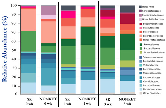 A total of 292,156 high-quality-filtered sequence reads from V1-V3 amplicons of the 16S rRNA were used for bacterial composition analysis. The mean relative abundance (%) of the main bacterial taxonomic groups is presented in Table 3 and Figure 3, with Firmicutes, Bacteroidetes, and Proteobacteria representing the most prominent phyla in this study. While fluctuations in the abundance of certain families were observed amongst groups and time points, statistical support for differences in taxonomic composition was found for only Eryspelotrichaceae, with lower abundance in the SK group compared to NONKET at 3 weeks (p < 0.05).