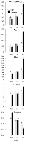 Mean values for α-diversity indices in fecal samples derivate from dairy calves born to dams classified as subclinical ketotic (SK; ≥1.4 mmol/L) or nonketotic (NONKET; <1.4 mmol/L) during the first 10 days postpartum. Statistical differences by ANOVA (p < 0.05). ab Different superscripts indicate that groups are significantly different by Tukey’s range test for multiple pairwise comparisons.