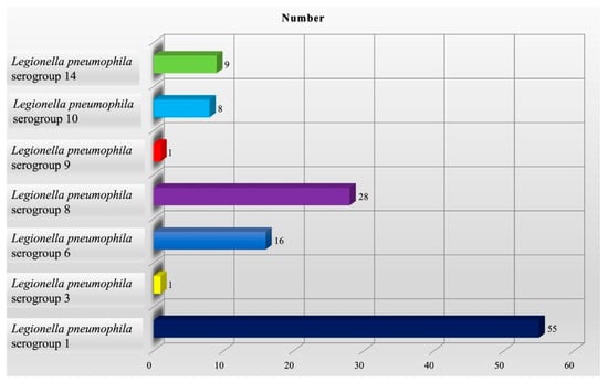 In 2019, n. 53 accommodation facilities were monitored, differently distributed throughout the regions: Naples (n. 37), Salerno (n. 11), Avellino (n. 2), Caserta (n. 2), and Benevento (n. 1). Legionella genus contaminated 20 (37.7%) of all tourist facilities evaluated. A total of 418 water samples, taken from different hot and cold water systems of hotels, were analyzed. Out of the 418 samples, 118 (28.2%) were positive for L. pneumophila. Of the 118 positive samples, 98 samples came from hot water circuits, and the remainder from cold water circuits. Serological typing of the 118 L. pneumophila isolate revealed that 55 (46.7%) are Legionella pneumophila serogroup 1; 1 (0.8%) is Legionella pneumophila serogroup 3; 16 (13.6%) are Legionella pneumophila serogroup 6; 28 (23.7%) are Legionella pneumophila serogroup 8; 1 (0.8%) is Legionella pneumophila serogroup 9; 8 (6.8%) are Legionella pneumophila serogroup 10; and 9 (7.6%) are Legionella pneumophila serogroup 14 (Figure 2).