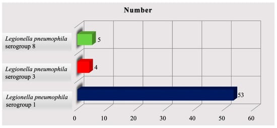 In 2020, n. 18 accommodation facilities were monitored, differently distributed throughout the region: Naples (n. 12), Salerno (n. 4), Avellino (n. 0), Caserta (n. 0), and Benevento (n. 2). Legionella genus contaminated 8 (44.4%) of all tourist facilities evaluated. A total of 273 water samples taken from different hot and cold water systems of hotels were analyzed. Out of the 273 samples, 62 (22.7%) were positive for L. pneumophila. Of the 62 positive samples, 48 samples came from hot water circuits, and the remainder from cold water circuits. Serological typing of the 62 L. pneumophila isolate revealed that 53 (85.5%) are Legionella pneumophila serogroup 1; 4 (6.5%) are Legionella pneumophila serogroup 3; and 5 (8.0%) are Legionella pneumophila serogroup 8 (Figure 3).