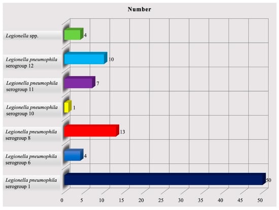 In 2021, n. 24 accommodation facilities were monitored, differently distributed throughout the region: Naples (n. 14), Salerno (n. 4), Avellino (n. 3), Caserta (n. 3), and Benevento (n. 0). Legionella genus contaminated 13 (54.2%) of all tourist facilities evaluated. A total of 357 water samples taken from different hot and cold water systems of hotels were analyzed. Out of the 357 samples, 89 (24.9%) were positive for L. pneumophila. Of the 89 positive samples, 75 samples came from hot water circuits, and the remainder from cold water circuits. Serological typing of the 89 L. pneumophila isolate revealed that 50 (56.2%) are Legionella pneumophila serogroup 1; 4 (4.5%) are Legionella pneumophila serogroup 6; 13 (14.6%) are Legionella pneumophila serogroup 8; 1 (1.1%) is Legionella pneumophila serogroup 10; 7 (7.9%) are Legionella pneumophila serogroup 11; 10 (11.2%) are Legionella pneumophila serogroup 12; and 4 (4.5%) are Legionella spp. (Figure 4).