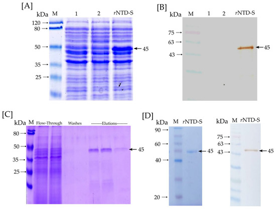 rNTD-S protein identification and purification: (A) SDS-PAGE and (B) Western blot—lines 1 and 2 correspond to lysate BL21 cells (negative control) and the rNTD-S line corresponds to lysate BL21-NTD-S cells (transformed cells); (C) Purifying process of rNTD-S with flow-through, washes, and elution phases; (D) SDS-PAGE and Western blot of purified and dialyzed rNTD-S protein. A specific signal of the rNTD-S protein at expected molecular weight (~45 kDa) is marked with a black arrow.