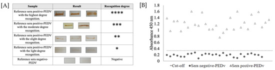 Immunoreactivity of purified rNTD-S protein. (A) Summary of Western blot analysis of the reference serum. Immunoreactivity was classified as follows: highest degree recognition (****); moderate degree recognition (***); slight degree recognition (**); light degree recognition (*); and negative sera (−). (B) Determination of the cut-off value using reference sera by iELISA. The dotted line represents the cut-off for iELISA and was calculated as 0.335, and 30 positive serum samples and 30 negative serum samples were evaluated using the developed iELISA. The sera above the dotted line were considered PEDV positive, and the sera below the dotted line were considered PEDV negative according to the cut-off value.