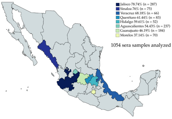Percentage of positive sera samples for each evaluated state by iELISA. The highest percentage of positive sera was observed in Jalisco (n = 287) with 78.74%, and the lowest was observed in Morelos (n = 70) with 37.14%.