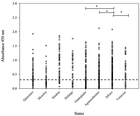 Statistical analysis carried out using one-way ANOVA showed a significant difference (* p < 0.05) between the evaluated sera from the main pig-producers states: Jalisco and Veracruz (Figure 5). It is important to mention that Jalisco has a high number of positive sera and more positive samples than Veracruz. Furthermore, between Jalisco and Guanajuato, there is a significant difference (* p < 0.05) in relation to the average OD450nm value, even though the “n” values for both states were similar. Finally, Aguascalientes is a state ubicated near Jalisco (with a similar “n” number); however, there was a significant difference (* p < 0.05), since the average OD450nm values were different in both states.