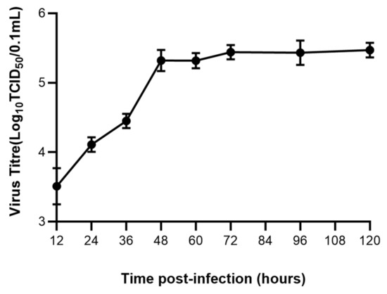 The viral titer of the FPV strain propagated in F81 cells was determined at different time. The viral titer reached 10−5.5 TCID50/0.1 mL at 48 h (Figure 1).