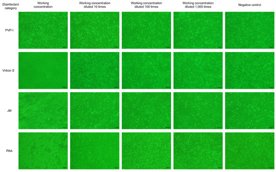 As results showed in Figure 2, PVP-I did not significantly affect cell viability at the working concentration, while the cellaggregation, and which eventually shed completely, appeared in F81 cells in the Virkon S- and JM-treated groups. The scenario also appeared in F81 cells in the PAA-treated group at the working concentration, even after a dilution of 100 times. The results indicated that Virkon S, JM and PAA will significantly affect cell viability at the working concentration, while PVP-I will not.