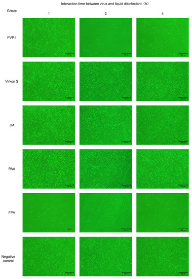 To confirm whether FPV has lost its infectivity after being inactivated by four disinfectants, the disinfected FPV was collected and inoculated in F81 cells. The results indicated no evident CPE was observed in the PAA-, Virkon S- and JM-treated groups, whereas CPE was observed in the PVP-I-treated group. The CPE that appeared in F81 cells of the PVP-I-treated group was the same as that in the positive control group, which is characterized by cell rounding, mitosis and shedding (Figure 3).