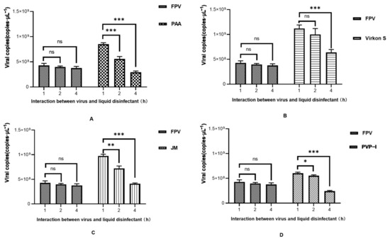 Time course study of viral DNA copies after disinfectant treatment. (A) PAA; (B) Virkon S; (C) JM; (D) PVP-I. Statistical analysis was performed by two-tailed Student’s t-test. Asterisks (*) indicate the statistical significance: * p < 0.05; ** p < 0.01; *** p < 0.001; ns, no significance.