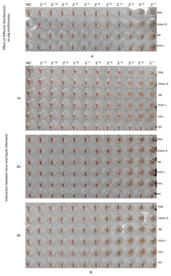 The hemagglutination assay (HA) was performed according to standard procedures. Briefly, two-fold dilutions of the disinfectant-containing medium were incubated with 1% porcine erythrocytes (diluted in PBS) in V-bottom, 96-well plates (NEST, 701211, Wuxi, Jiangsu, China). Plates were incubated for 2 h at 4 °C, after which hemagglutination titer was scored.