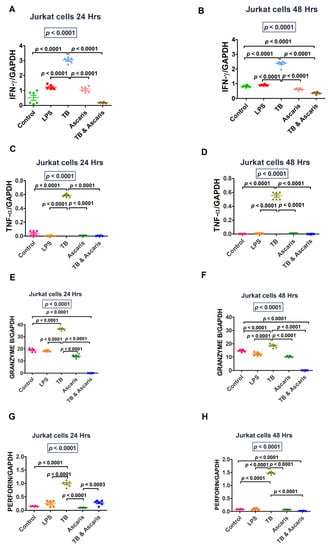 Transcription levels data for IFN-γ, TNF-α, granzyme B, and perforin are shown for Jurkat cells at 24 and 48 h time points. The unstimulated control cells and LPS-stimulated cells were negative and positive controls, respectively. (A) IFN-γ levels for Jurkat cells stimulated for 24 h, (B) IFN-γ levels for Jurkat cells stimulated for 48 h, (C) TNF-α levels for Jurkat cells stimulated for 24 h, (D) TNF-α levels for Jurkat cells stimulated for 48 h, (E) granzyme B levels for Jurkat cells stimulated for 24 h, (F) granzyme B levels for Jurkat cells stimulated for 48 h, (G) perforin levels for Jurkat cells stimulated for 24 h, and (H) perforin levels for Jurkat cells stimulated for 48 h.
