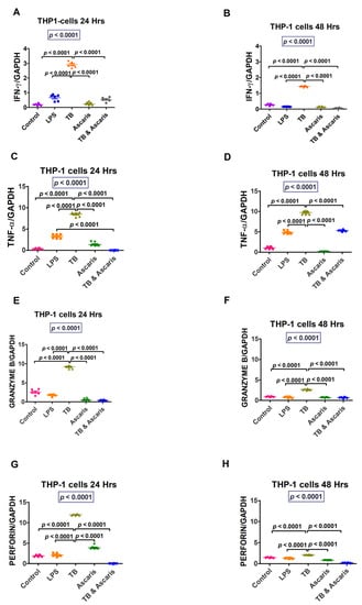 Transcription level data for IFN-γ, TNF-α, granzyme B, and perforin are shown for THP-1 cells at 24 and 48 h time points. The unstimulated control cells and LPS-stimulated cells were negative and positive controls, respectively. (A) IFN-γ levels for THP-1 cells stimulated for 24 h, (B) IFN-γ levels for THP-1 cells stimulated for 48 h, (C) TNF-α levels for THP-1 cells stimulated for 24 h, (D) TNF-α levels for THP-1 cells stimulated for 48 h, (E) granzyme B levels for THP-1 cells stimulated for 24 h, (F) granzyme B levels for THP-1 cells stimulated for 48 h, (G) perforin levels for THP-1 cells stimulated for 24 h, and (H) perforin levels for THP-1 cells stimulated for 48 h.