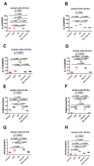 Jurkat cell line responses for Th1/pro-inflammatory (IL-2 and IL-17) and transcription factors (Eomes and NFATC2) at 24 and 48 h time points. The unstimulated control cells and LPS-stimulated cells were negative and positive controls, respectively. (A) IL-2 levels for Jurkat cells stimulated for 24 h, (B) IL-2 levels for Jurkat cells stimulated for 48 h, (C) IL-17 levels for Jurkat cells stimulated for 24 h, (D) IL-17 levels for Jurkat cells stimulated for 48 h, (E) EOMES levels for Jurkat cells stimulated for 24 h, (F) EOMES—transcription levels for Jurkat cells stimulated for 48 h, (G) NFATC2 levels for Jurkat cells stimulated for 24 h, and (H) NFATC2 levels for Jurkat cells stimulated for 48 h.