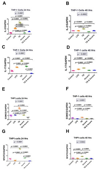 THP-1 cell line responses for Th1/pro-inflammatory (IL-2 and IL-17) and transcription factors (Eomes and NFATC2) at 24 and 48 h time points. The unstimulated control cells and LPS-stimulated cells were negative and positive controls, respectively. (A) IL-2 levels for THP-1 cells stimulated for 24 h, (B) IL-2 levels for THP-1 cells stimulated for 48 h, (C) IL-17 levels for THP-1 cells stimulated for 24 h, (D) IL-17—transcription levels for THP-1 cells stimulated for 48 h, (E) EOMES levels for THP-1 cells stimulated for 24 h, (F) EOMES levels for THP-1 cells stimulated for 48 h, (G) NFATC2 levels for THP-1 cells stimulated for 24 h, and (H) NFATC2 levels for THP-1 cells stimulated for 48 h.