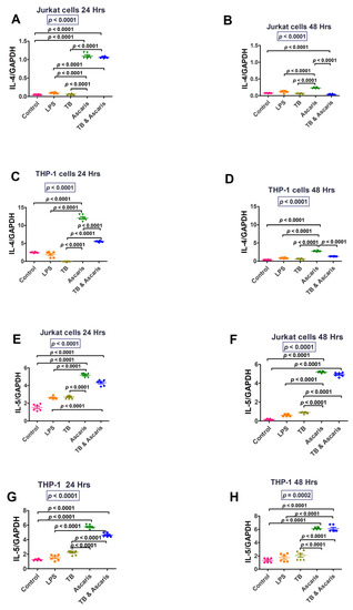 IL-4 and IL-5 responses in TB, A. lumbricoides, and dually stimulated Jurkat and THP-1 cells at 24 and 48 h time points. (A) IL-4 levels for Jurkat cells stimulated for 24 h, (B) IL-4 levels for Jurkat cells stimulated for 48 h, (C) IL-4—levels for THP-1 cells stimulated for 24 h, (D) IL-4 levels for THP-1 cells stimulated for 48 h, (E) IL-5 levels for Jurkat cells stimulated for 24 h, (F) IL-5 levels for Jurkat cells stimulated for 48 h, (G) IL-5 levels for THP-1 cells stimulated for 24 h, and (H) IL-5—transcription levels for THP-1 cells stimulated for 48 h.