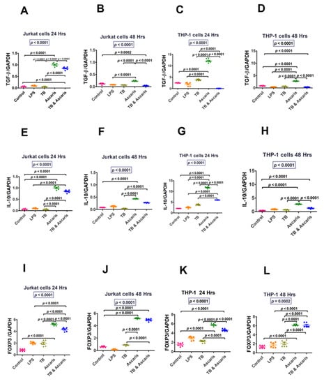 Jurkat and THP1 cell responses for regulatory cytokines (TGF-β, IL-10, and FoxP3) at 24 and 48 h time points. The unstimulated control and LPS-stimulated cells were used as negative and positive controls, respectively. (A) TGF-β levels for Jurkat cells stimulated for 24 h, (B) TGF-β levels for Jurkat cells stimulated for 48 h, (C) TGF-β levels for THP-1 cells stimulated for 24 h, (D) TGF-β levels for THP-1 cells stimulated for 48 h, (E) IL-10 levels for Jurkat cells stimulated for 24 h, (F) IL-10 levels for Jurkat cells stimulated for 48 h, (G) IL-10 levels for THP-1 cells stimulated for 24 h, (H) IL-10 levels for THP-1 cells stimulated for 48 h, (I) FoxP3 levels for Jurkat cells stimulated for 24 h, (J) FoxP3 levels for Jurkat cells stimulated for 48 h, (K) FoxP3 levels for THP-1 cells stimulated for 24 h, (L) FoxP3 levels for THP-1 cells stimulated for 48 h.