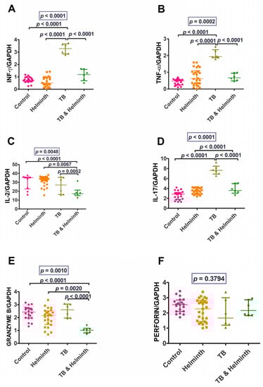 IFN-γ, TNF-α, and IL-17 were highest in TB-infected group (albeit, there were only six individuals). Perforin was similar across all groups, while granzyme B levels differed between the control and coinfected groups (p < 0.0001), between the helminth-infected and coinfected groups (p = 0.0020), and between TB-infected and coinfected groups (p < 0.0001). IL-2 levels differed between the control and the TB plus helminth-coinfection group (p < 0.0001) and also between the helminth-infected and coinfected group (p = 0.0067).