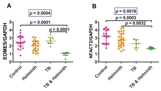 Eomes levels were higher in the controls than in the TB/helminth co-infected (p < 0.0001) and higher in the TB-infected compared to the coinfected individuals (p < 0.0001). NFATC2 levels were significantly higher among the controls compared to the coinfected individuals (p = 0.0003) and higher in the helminth-infected than in the TB/helminth-coinfected individuals (p = 0.0032).