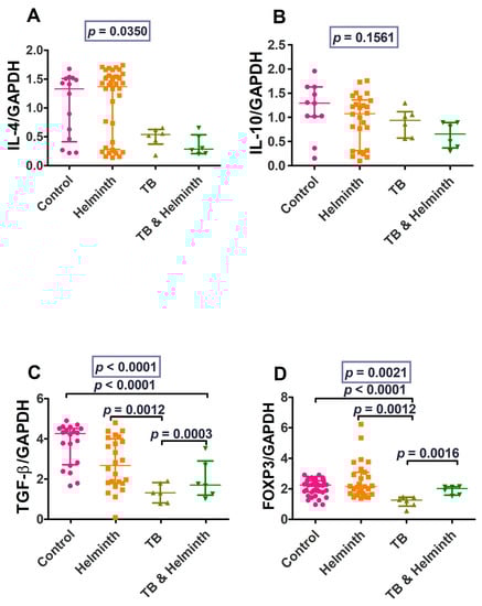 IL-4, IL-10, TGF-β, and FoxP3 gene transcription levels values. (A) IL-4 levels, (B) IL-10 levels, (C) TGF-β levels, and (D) FoxP3 levels.