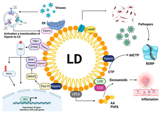 Involvement of LDs in the immune system. One of the proteins that can interact with LDs after a viral infection is viperin. This protein is synthesized from signaling through TLRs. It is one of the main proteins belonging to ISG, which alone can have an antiviral effect as it can catalyze CTP to ddCTP, a ribonucleotide that inhibits the synthesis of viral RNA. However, for there to be a more potent and antiviral effect, ISGs usually bind to more proteins with the same purpose; in this sense, it has been observed that STING can bind to LDs after that Viperin has done so, and form a more robust complex with more significant antiviral activity. Another of the bonds observed when Viperin acts in LDs is the participation of Pex19, which is fundamental for forming peroxisomes that favor the antiviral response. Cathelicidins which are small molecules shown to have antiviral activity, can also be associated with LDs. The enzymes lipoxygenase and cyclooxygenase involved in activating eicosanoids from polyunsaturated fatty acids may also be associated with LDs and, during viral infections, may trigger inflammatory events.