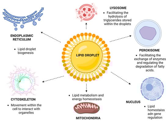 LDs are also highly dynamic units within the cell, capable of interacting with most cellular organelles. LDs interact significantly with the ER, cytoskeleton, mitochondria, nucleus, peroxisomes, and lysosomes (Figure 3).