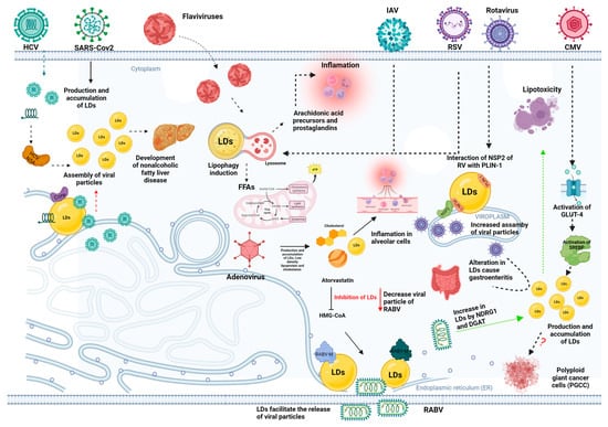 The role of LDs during viral infection. During HCV infection, there is an increase and accumulation of LDs; this increase is related to the appearance of non-alcoholic fatty liver. In the case of flaviviruses, LDs are degraded through lipophagy to obtain FFAs. However, the formation of FFAs can favor the formation of arachidonic acid and precursors of inflammatory molecules. SARS-Cov2 infection induces the activation of proteins involved in lipogenesis, including PPARγ and SREBP-1, and promotes LDs biogenesis to carry out the virus’s replication cycle. LDs are degraded during infection with influenza A virus (IAV) and respiratory syncytial virus (RSV). On the other hand, during adenovirus infection, it has been seen that there is an accumulation and production of LDs related to the formation of an inflammatory state within the target cells. In the case of rabies virus (RABV), there is an increase in LDs mediated by the enzymes DGAT and NDRG1 (green arrow), which facilitate the release of viral particles. However, this increase also generates a lipotoxic state within the cells. In addition, it is known that inhibition of LDs through the drug Atorvastatin affects the viral replication cycle (red arrow). In the case of Rotaviruses, the NSP2 protein can interact with the PLI-1 protein to increase the assembly of viral particles and the number of LDs, which is related to the appearance of gastroenteritis. Finally, in the case of cytomegalovirus, it has been observed that the increase in GLUT-4 receptors is associated with the activation of the enzyme SREBP, which in turn promotes the production and accumulation of LDs, which has been linked to the appearance of Polyploid cancer.